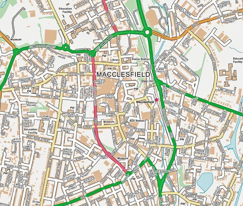 Street Map Of Macclesfield Macclesfield Street Map 2021: Fed-up residents on a street in Macclesfield have expressed their frustration at a sinkhole that appeared over 18 months ago by writing a song and making a music video dedicated to it. The hole . If you are looking for a simple-enough example to get into both subjects with a real-world application, [geomatics]โ flight tracker uses cartopy to create a map using Open Street Map data .